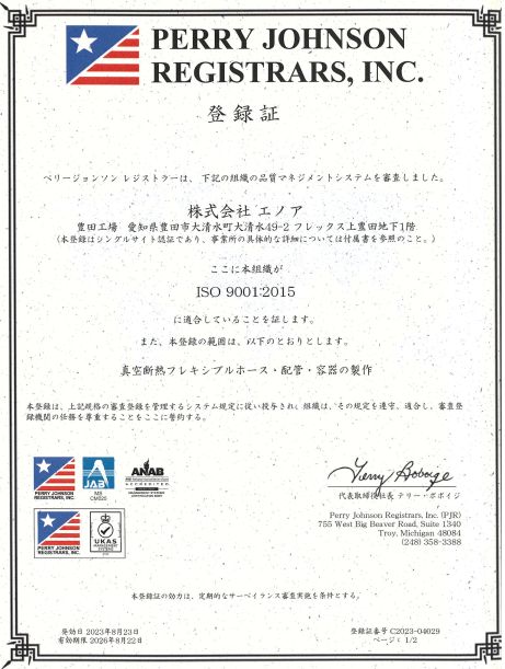 株式会社エノアは、2023年8月23日に本社および豊田工場にて【真空断熱フレキシブルホース・配管・容器の製作】ISO 9001:2015 に適合・登録されました。