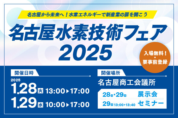 2025年1月28~29日に名古屋商工会議所にて開催される、「名古屋水素技術フェア」に出展いたします。皆様のご来場、心よりお待ちしております。
