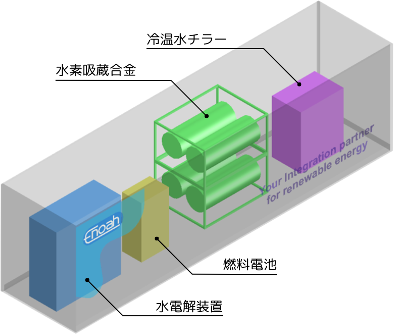 このシステムは、従来なら捨ててしまう再エネ電力を水素ガスに換えて貯蔵し、必要なときに水素燃料電池によって行う発電によりタイムシフト・シーズンシフトした電力を再利用することを特徴とし、エノアのノウハウが詰め込まれた高度な制御(EMS)により実現しています。