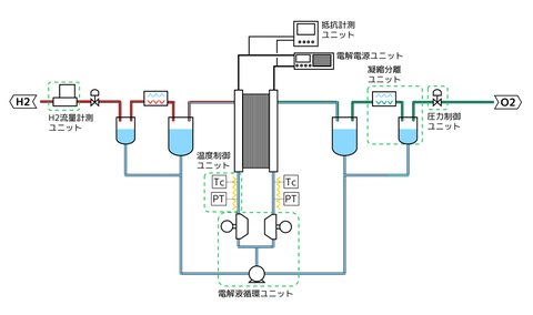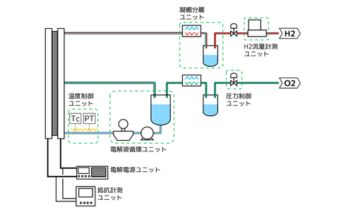 燃料電池評価装置で培った流体制御・電気制御技術に加え、豊富な水電解スタックの取扱い経験を活かすことで、