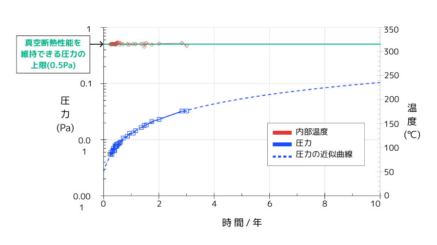1/2”用真空断熱フレキシブルチューブを用いて内部を300℃に加熱し、約2.5年間にわたる長期維持試験を実施しました。 近似曲線から、断熱性能は10年以上維持が可能であると予測できます。