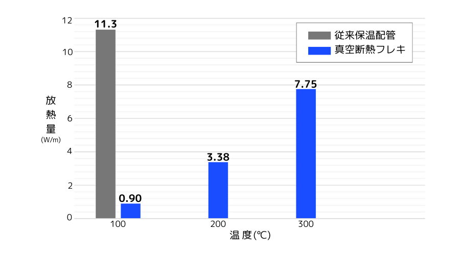 真空断熱フレキシブルチューブの100℃の放熱量は、従来保温管の約8%と非常に少ないことが分かります。